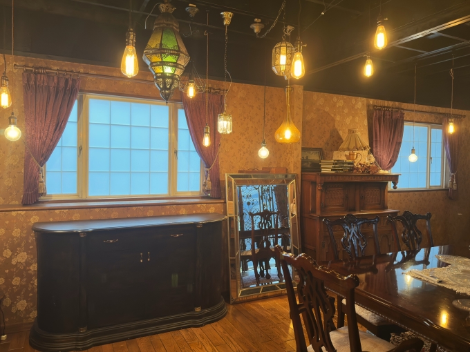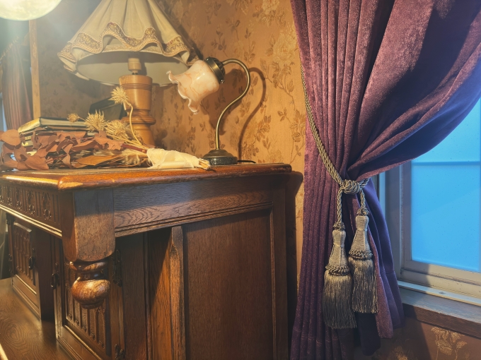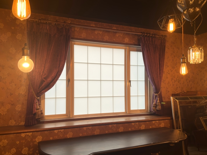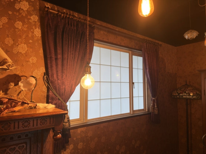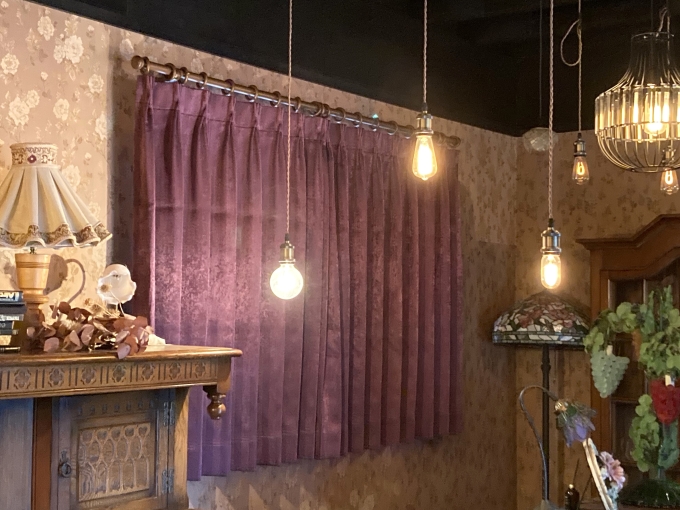 岐阜県羽島市にあるレンタルスタジオ『岐阜スタジオ』様のアンティーク調のお部屋に、カーテンを取り付けさせていただきました。